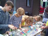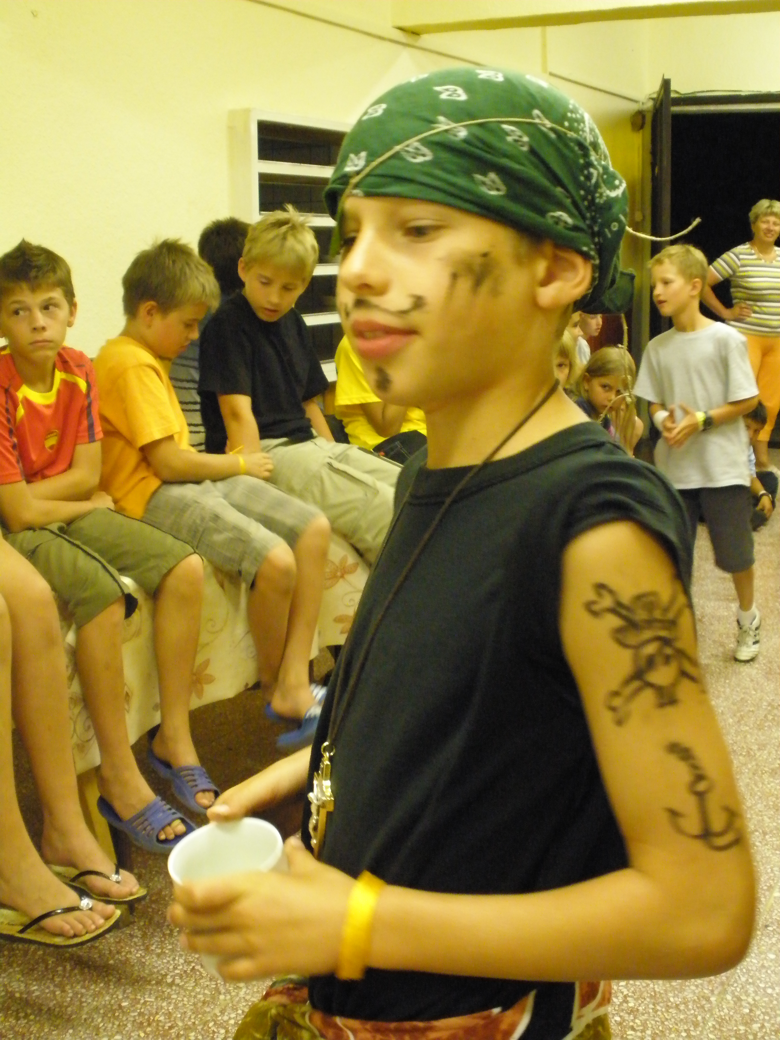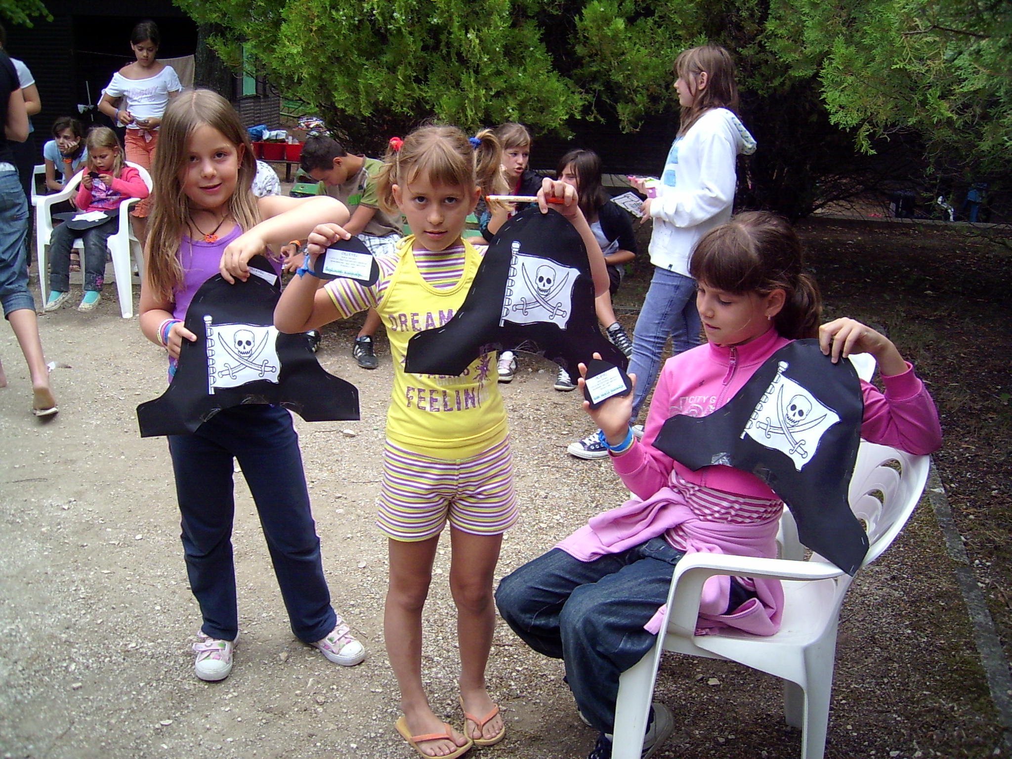 | 2. nap: Csoportzászló-festés, titkos kincsek térképe - játék, lovaglás, kalózjátékok (palackposta, hajóroncsok keresése, tengeri gyöngyszemek), focizás Laci bácsival minden mennyiségben |